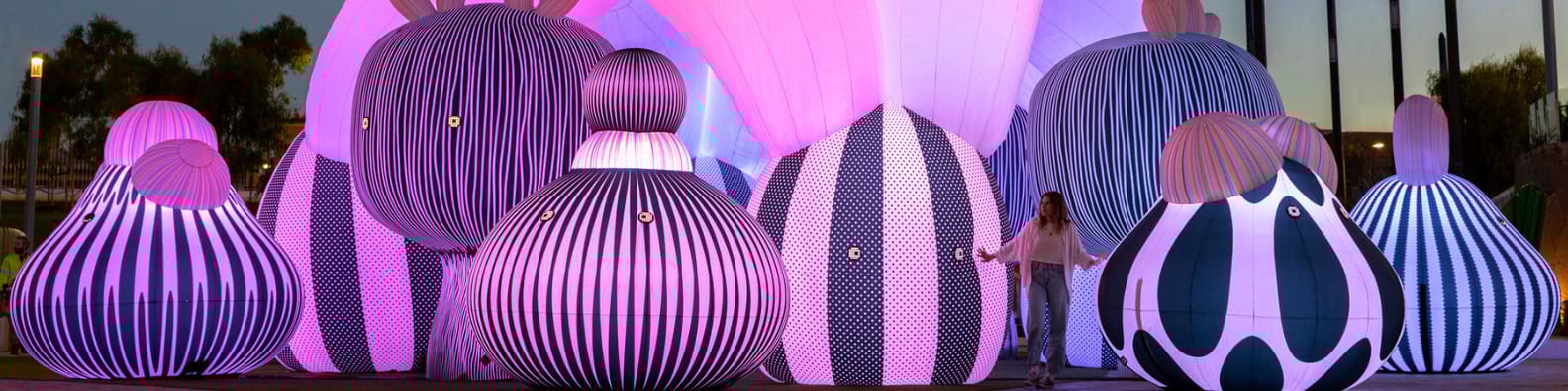 16 massive glowing inflatables with sound and friendly LED eyes.